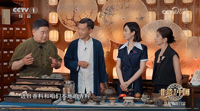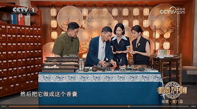 2025年十月金秋时节,中央电视台CCTV-1《非遗里的中国》节目播出单霁翔、王嘉宁、贾静雯走进妙吉祥与传承人陈建兵互动体验闽南传统香制作技艺。