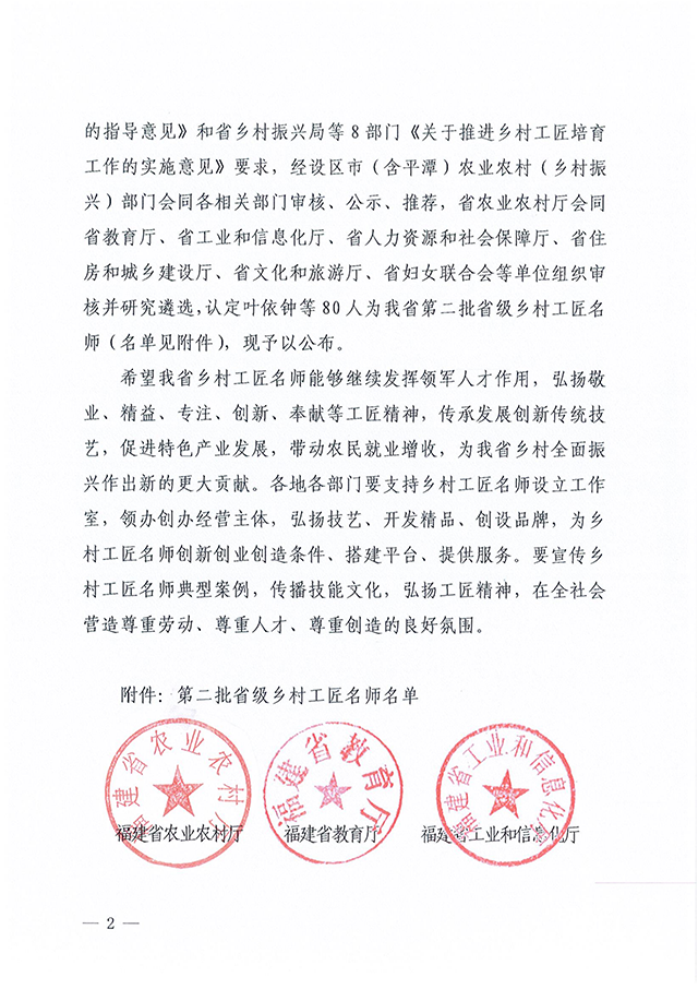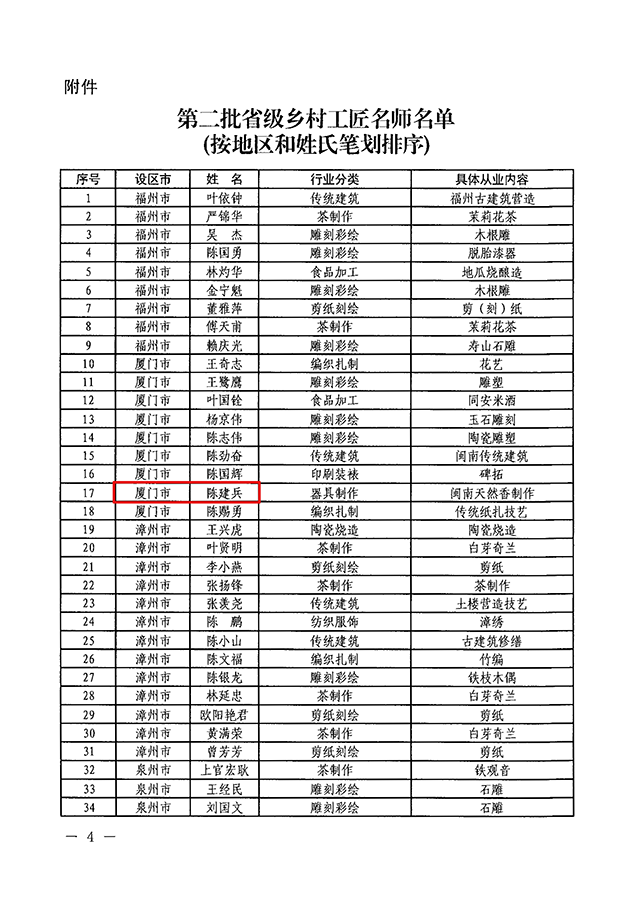 2025年1月,福建省农业农村厅会同省教育厅、省工业和信息化厅、省人力资源和社会保障厅、省住房和城乡建设厅、省文化和旅游厅、省妇女联合会等部门经过层层遴选认定的第二批“省级乡村工匠名师”名单正式公布,国家级非物质文化遗产、厦门老字号“妙吉祥”传承人陈建兵名列其中。