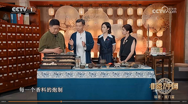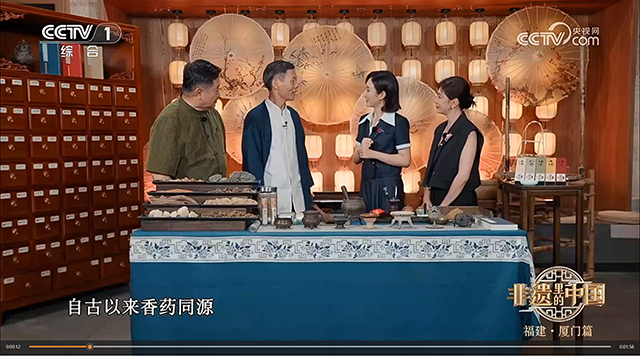 2025年十月金秋时节,中央电视台CCTV-1《非遗里的中国》节目播出单霁翔、王嘉宁、贾静雯走进妙吉祥与传承人陈建兵互动体验闽南传统香制作技艺。
